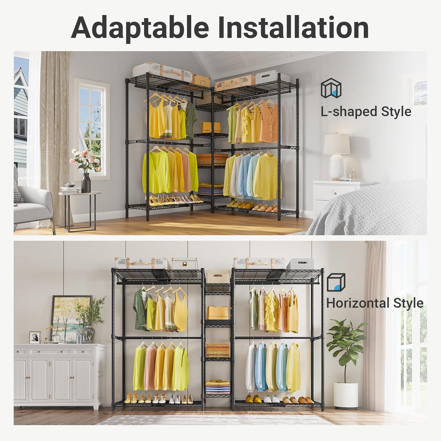 DIY Closet Installation: VIPEK X3 garment rack can be assembled in 2 shapes for different types of rooms. The horizontal assembly way for the reach-in and walk-in closet, and the L shape for the corner space